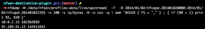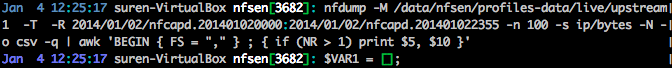 my $nfdump_command = "nfdump -M /data/nfsen/profiles-data/live/upstream1 -T -R ${syear}/${smonth}/${sday}/nfcapd.${syear}${smonth}${sday}0000:${eyear}/${emonth}/${eday}/nfcapd.${eyear}${emonth}${eday}2355 -n 100 -s ip/bytes -N -o csv -q | awk 'BEGIN { FS = \",\" } ; { if (NR > 1) print \$5, \$10 }'";