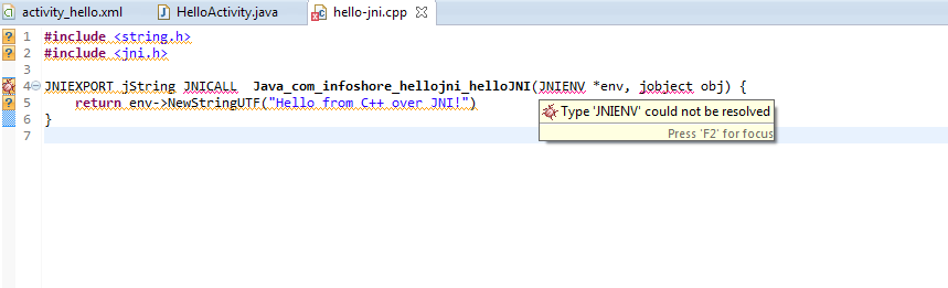 我是Android中的新手,运行第一个hello JNI示例。我添加了jni文件夹,并添加了c文件,在其中我得到了一些未解决的错误。