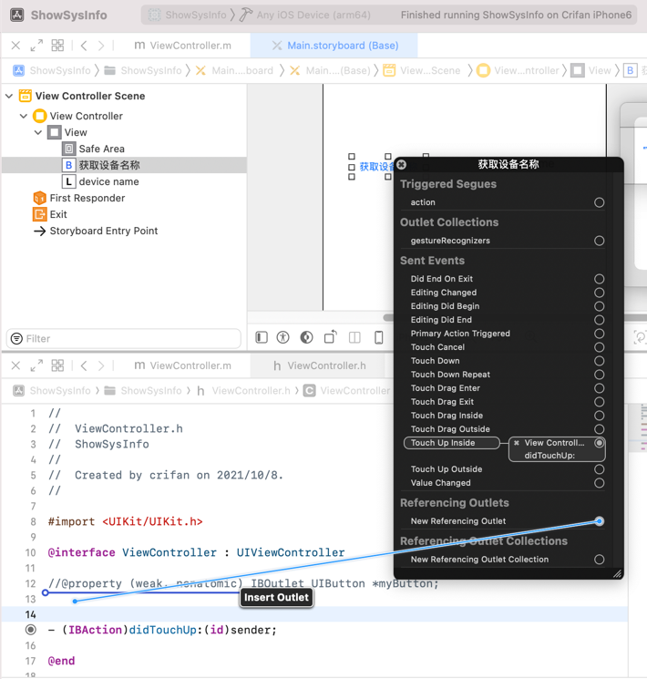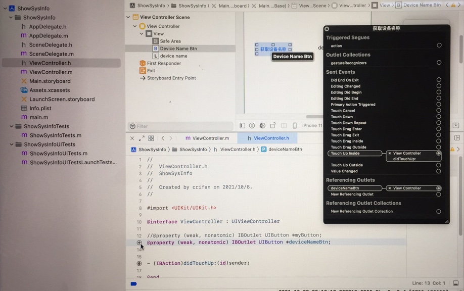 在Storyboard ->中,选择您的UIButton ->,右键单击UIButton -> Referencing Outlets -> New Referencing Outlet ->,将其拖到ViewController.h ->得到通知,Insert Outlet ->弹出窗口->设置Name到您想要的位置,例如deviceNameBtn -> Name自动生成代码到