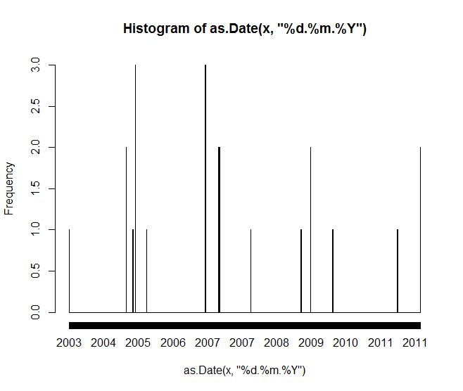 hist(as.Date(x, '%d.%m.%Y'), breaks="days", freq=TRUE)