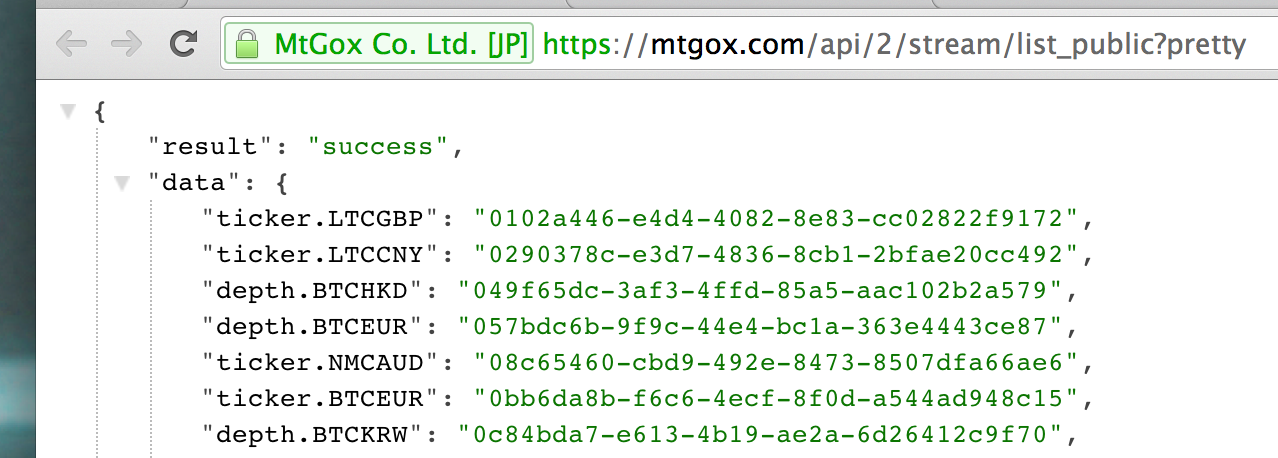 注意:您可以通过请求通道列表API调用:PubNub Mt.Gox通道流馈源Ticker/贸易/深度信号列表找到更多的Mt.Gox通道。