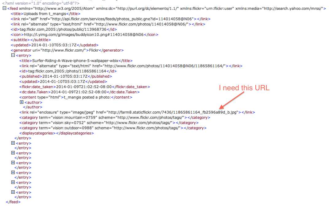 - (void)parser:(NSXMLParser *)parser didStartElement:(NSString *)elementName namespaceURI:(NSString *)namespaceURI qualifiedName:(NSString *)qName attributes:(NSDictionary *)attributeDict;当elementName是@"link"时,您的url应该在attributeDict[@"href"]中。