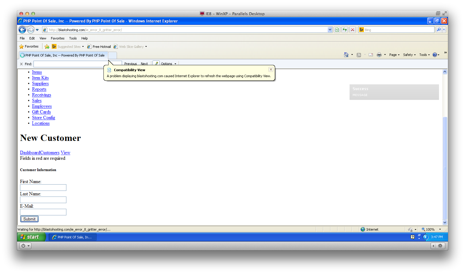 该消息是“显示blastohosting.com导致Internet使用兼容性视图刷新网页的问题”