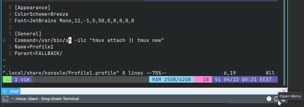 /usr/bin/sh -ilc "tmux attach || tmux new"管理概要文件+配置文件所在的位置,以防Yakuake/Konsole不再启动: