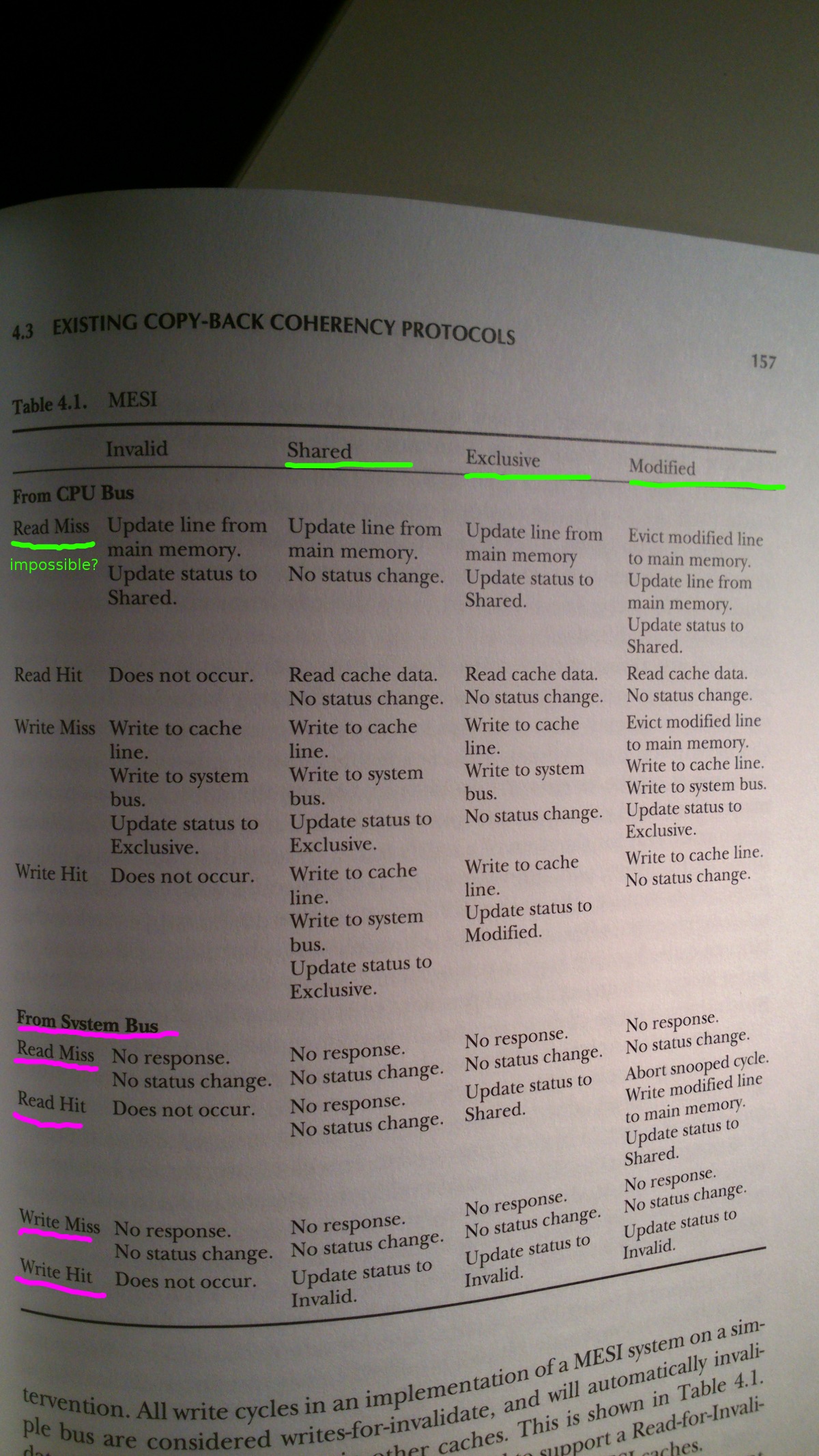 在Jim的“缓存内存手册”(摘录如下)中,作者拥有MESI协议的表描述。在我看来,这张桌子看上去很不清楚,不幸的是,案文没有帮助。