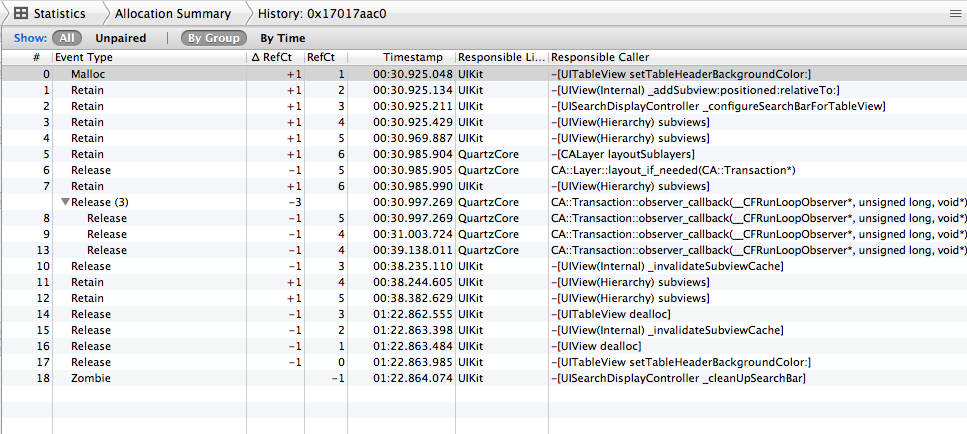 问题:我正在使用已启用的仪器和NSZombies,这是错误的报告。我不会把事情搞砸的。据我所知,这显示了ref Count +es和-es。但是,生成此错误的代码在哪里呢?我只看到负责任的调用者是UIVIews,CATransactions,我的代码在哪里?