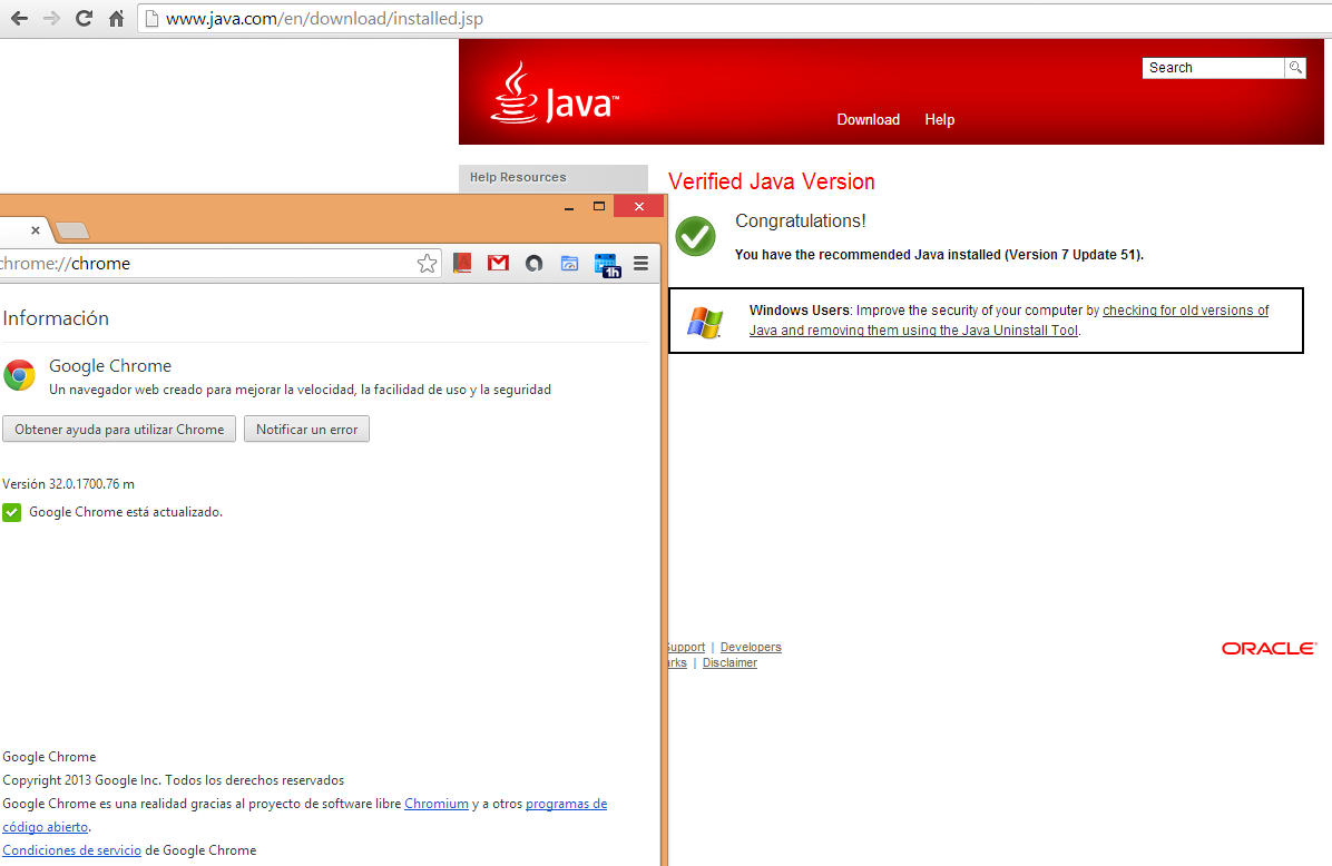 另外,我使用java.com工具卸载任何以前的和不安全的JRE版本(使用Google )。在反复检查IE11之后,我可以看到启用了Java加载项并将其版本化到7u51: