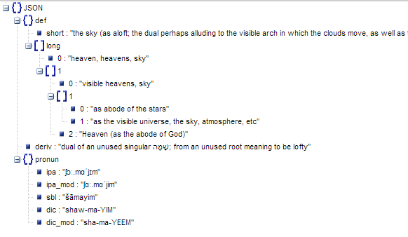 {"def":{"short":"the sky (as aloft; the dual perhaps alluding to the visible arch in which the clouds move, as well as to the higher ether where the celestial bodies revolve)","long":["heaven, heavens, sky",["visible heavens, sky",["as abode of the stars","as the visible universe, the sky, atmosphere, etc"],"Heaven (as the abode of God)"]]},"deriv":"dual of an unused singular שָׁמֶה; from an unused root meaning to be lofty","pronun":{"ipa":"ʃɔː.mɑˈjɪm","ipa_mod":"ʃɑː.mɑˈjim","sbl":"šāmayim","dic":"shaw-ma-YIM","dic_mod":"sha-ma-YEEM"}}更多的数据,我做了这个: