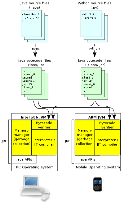 JVM一个一个地遍历操作码列表,使用自己的内存来模拟硬件组件(例如堆栈、寄存器、主内存),并使用原始算法和逻辑操作来模拟ALU。这些模拟组件也构成JVM的ISA。这是任何翻译的基本结构,无论是给予还是接受。然而,为了改进Java应用程序的运行时,JVM将“热点”编译成机器特定的代码,以获得最佳性能。热点是代码中经常运行的部分。这就是所谓的“即时”编译,可以在程序执行时完成。这种技术使Java的性能更接近编译语言的性能。JIT也在.NET框架中使用。