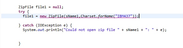 在我的Java代码中没有编译错误。在使用ZipFile时,使用用于Java7的两个参数时,请参见red。Java 6中的ZipFile构造函数只有一个参数。在Java 7中有两个参数: