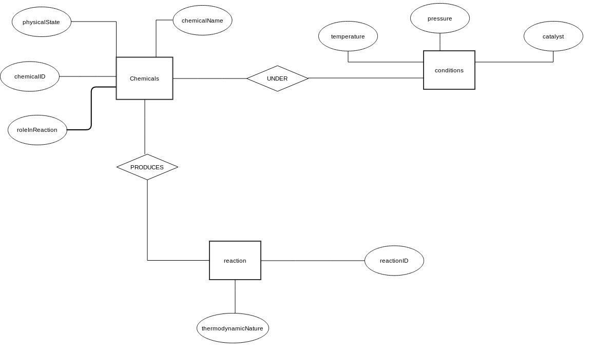 在我看来,化学品、反应和条件之间的关系应该是三元的,而反应与化学品之间的关系应该是另一种关系,以代表所生产的化学品。以下是声明:“化学品在特定条件下反应,反应产生化学物质。”