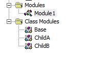 您可以在VBA中实现半装饰器:-)模式。假设我们有一个基类和两个子类。如果在子类中使用Implements关键字,您将发现子类与基类具有相同的接口,同时在每个子类中声明基类的私有实例,并将子类的调用重定向到基类。