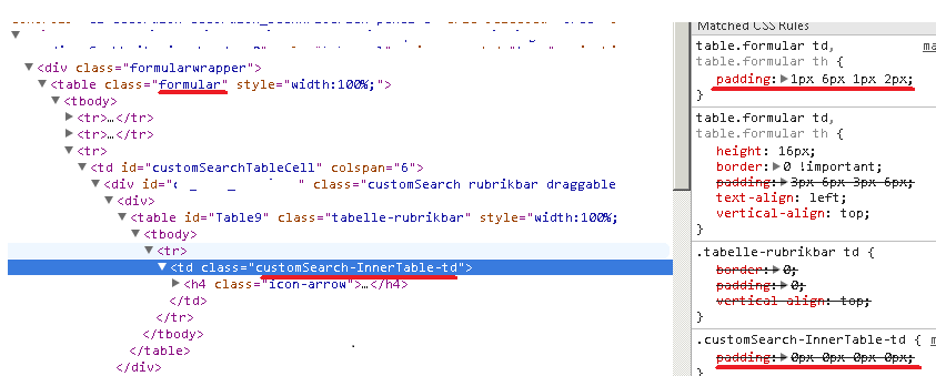 下面,在公式表的一个tds中,我得到了一个新的表,其中有一个类表--rubrikbar。此表包含一个带有类customSearch-InnerTable-td的td,该类应该覆盖填充。但是在这种情况下,继承的公式td正在覆盖customSearch-InnerTable-td。