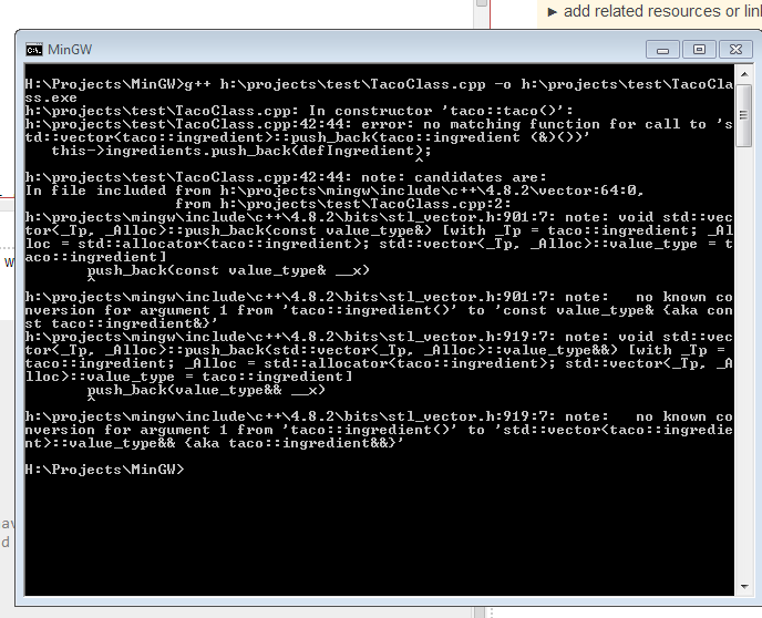 您有指针向量,您尝试push_back的不是一个指向成分的指针,而是一个成分对象。从将vector<ingredient*> ingredients;更改为vector<ingredient> ingredients;开始。