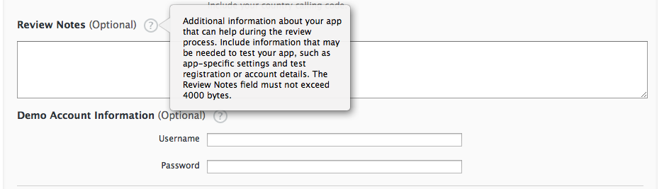 请在您的应用程序版本信息的Review部分提供演示帐户详细信息。请确保您所提供的信息包括演示应用程序功能所需的任何数据。