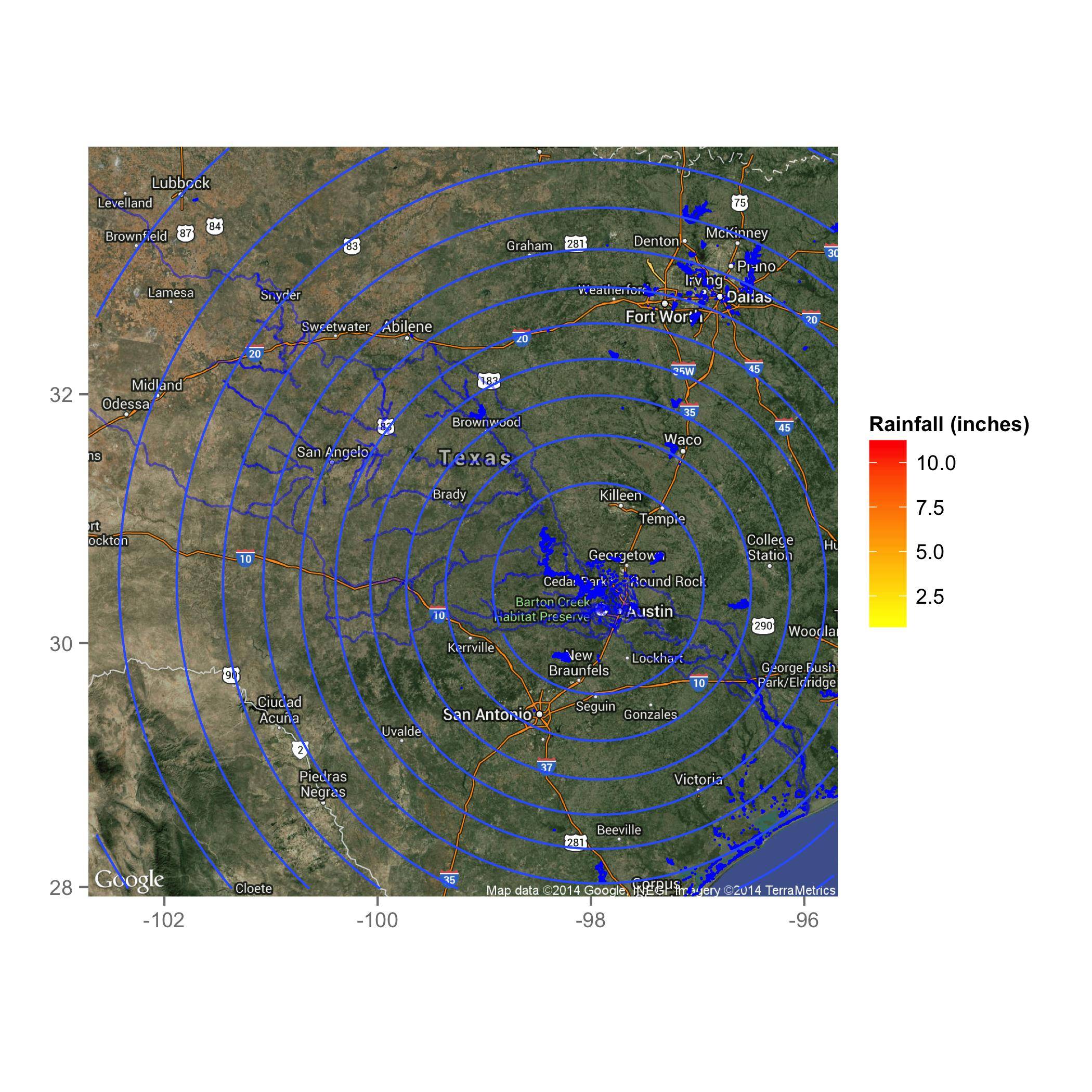 scale_fill_continuous( name = "Rainfall (inches)", low = "yellow", high = "red" ) 问题是geom_contour不尊重fill=...。您需要将stat_contour(...)与geom="polygon" (而不是"line")结合使用。
