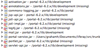 正如您所看到的,这解决了一半以上缺失的.jars,但是那些仍然缺少的则声称构建路径是相同的,因此它们在回购中丢失,或者需要构建。我不知道是哪一个。