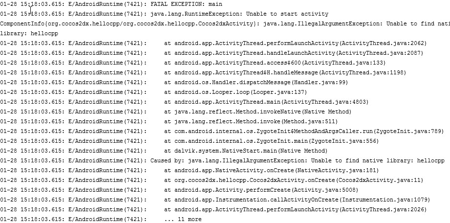 我已经开始学习Coco2d-x,并希望在我的android手机上运行这个示例应用程序。我在eclipse中导入了示例项目Hellocpp,并修复了库路径。我可以在我的设备上安装它,但当我运行它时,我会出错。我遵循本教程:茧2d-x请帮助我。