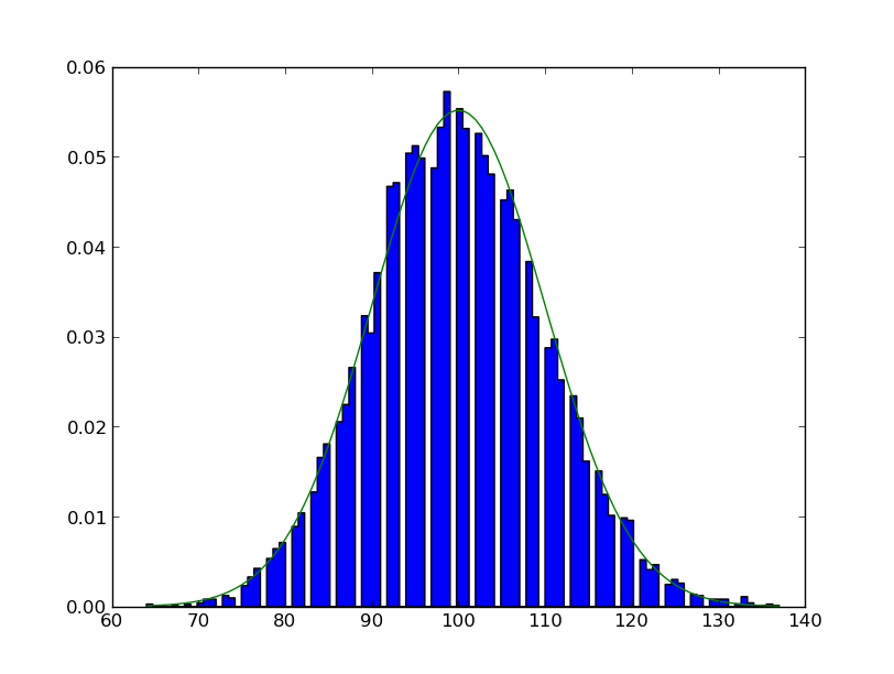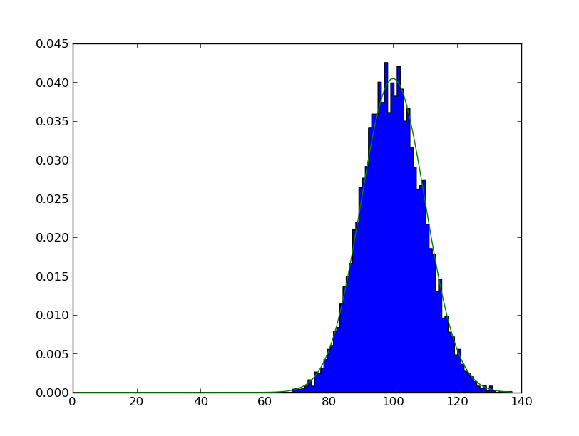 Y = norm.pdf(edges, mean, sd) # this is how to do it with the sciPy version of a normal PDF