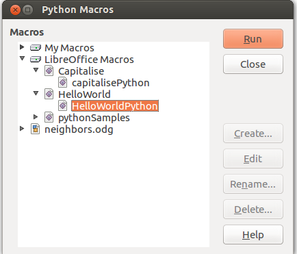 显然,LibreOffice没有编辑器,所以我不得不在其他地方编写宏,然后执行它们。