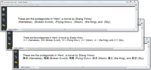 在图8.3中,您可以看到中文文本没有显示在上面的窗口中。通过修改表单(使用两种不同的策略),中文文本出现在下面两个窗口中。注意,在中间窗口的情况下,中文文本不会出现在所有的观众中。