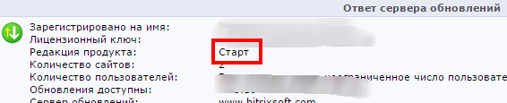 打开/bitrix/admin/sysupdate.php,在页面‘Редакцияпродукта:’底部找到这个单词,就在对面你会看到你的版本。下面的示例显示了"Старт“版本