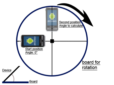 我想计算一下旋转后起点和位置之间的角度。在这个例子中,90度。该装置在板上,顺时针旋转。设备不动,只有板旋转。如何计算角度?这张照片说明了我的意思。角度可能在0到360度之间。如果你有问题,请问我。