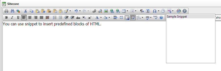我试图为Sitecore中的富文本编辑器(RTE)创建一个下拉按钮,但无法找到如何实现这个按钮。我希望类似于下面所示的“插入代码段”命令,但下拉列表的来源是由主数据库中的内容驱动的,而不是html编辑器配置文件中的核心项。
