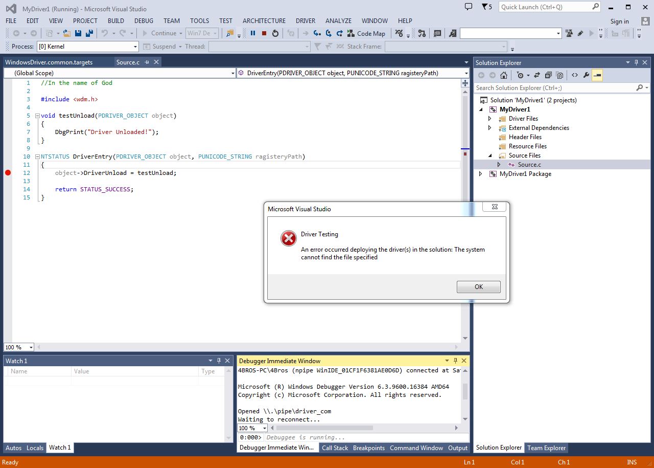 我试图在2013中创建一个非常简单的WDM驱动程序。我已经成功地提供了一个使用串口在wmware机器上运行win7 sp1 x86的虚拟pc。现在我想调试驱动程序,我得到了错误: