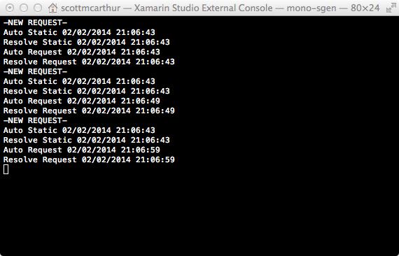 因此,在三个不同的请求之后,使用autowire和TryResolve方法,我们可以看到静态的工作和请求的作用域是一样的。