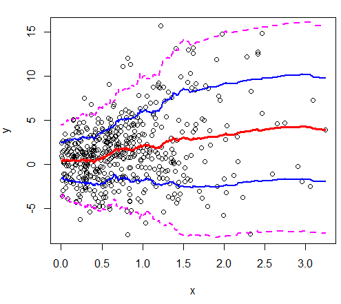y <- rnorm(500, mean=2*x, sd=2+2*x)