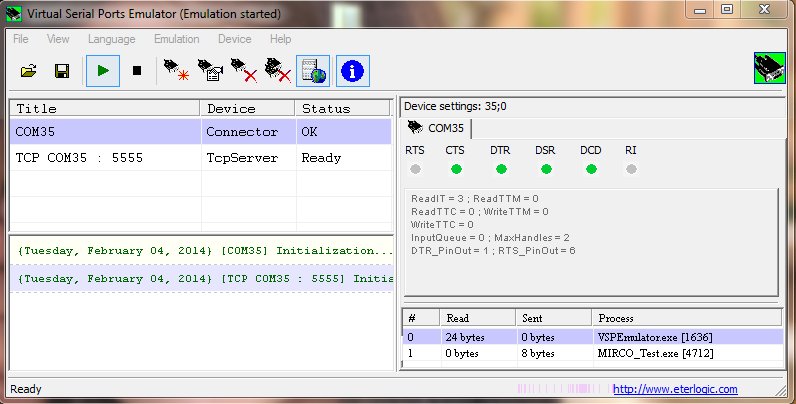 在上面的示例中,我创建了一个MICRO_Test应用程序(c++),它只需连接到虚拟串口。当我将数据写入这个端口时,所有客户端都会接收到它。