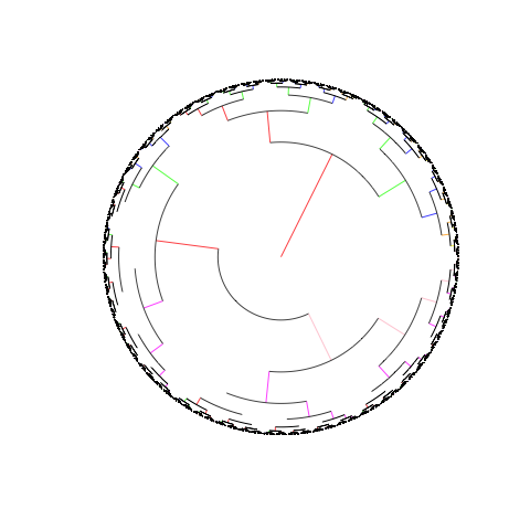 plot(as.phylo(fit),type='fan',tip.color=color_list[clus],label.offset=0.1,no.margin=TRUE) 我不确定您想使用哪种类型的聚类方法(我使用的是Ward的方法),但这就是您要使用的方法。
