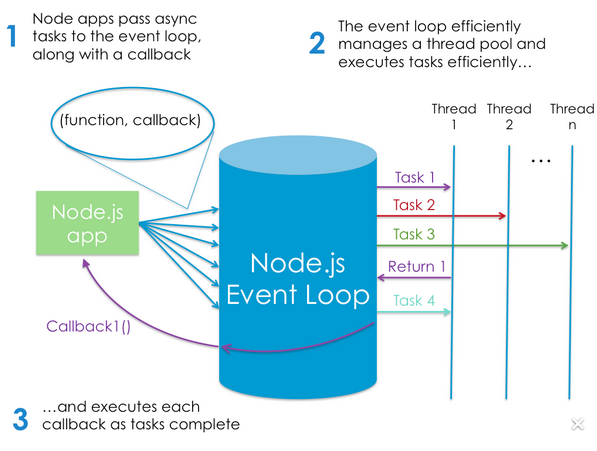 需要理解的一个关键问题是,节点在大部分的繁重工作中都依赖于操作系统。因此,传入的网络请求实际上是由操作系统本身跟踪的,当节点准备处理一个请求时,它只是使用一个系统调用来向OS请求一个网络请求,并准备好要处理的数据。那么多的IO“工作”节点做的要么是“嘿OS,有网络连接的数据可以读取吗?”或者“嘿,OS,我的任何优秀的文件系统调用都准备好了吗?”节点将根据其内部算法和事件循环引擎的设计,选择JavaScript中的一个“滴答”执行,运行它,然后再次重复该过程。这就是事件循环的含义。节点基本上在任何时候都决定“我应该运行的下一个小JavaScript是什么?”,然后运行它。这是操作系统完成IO的因素,以及通过调用setTimeout或process.nextTick在setTimeout中排队的事情。