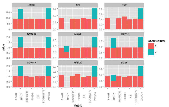 ggplot(df.mlt, aes(x=Metric, y=value, fill=as.factor(Time))) +