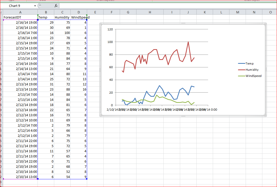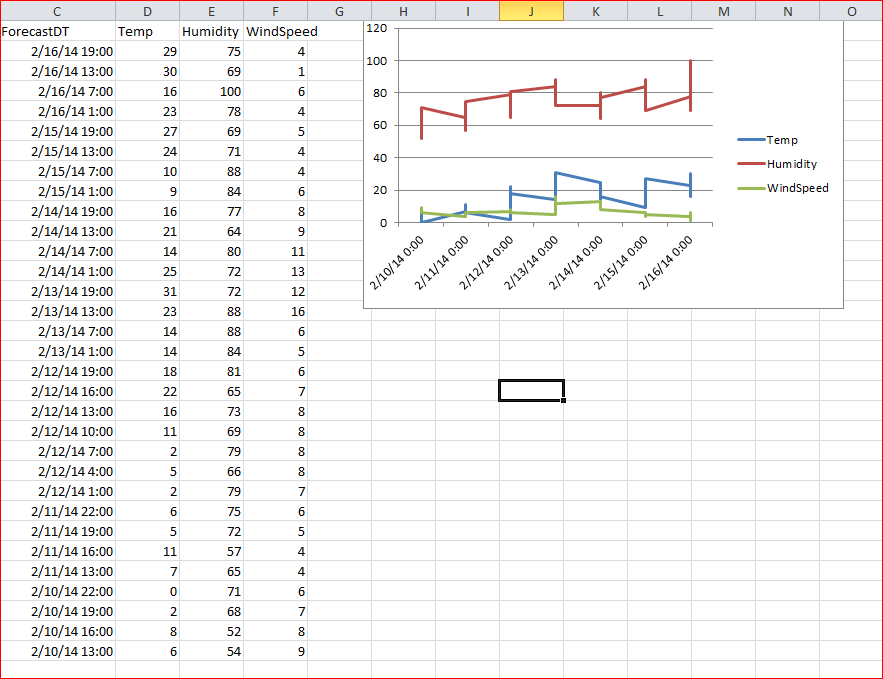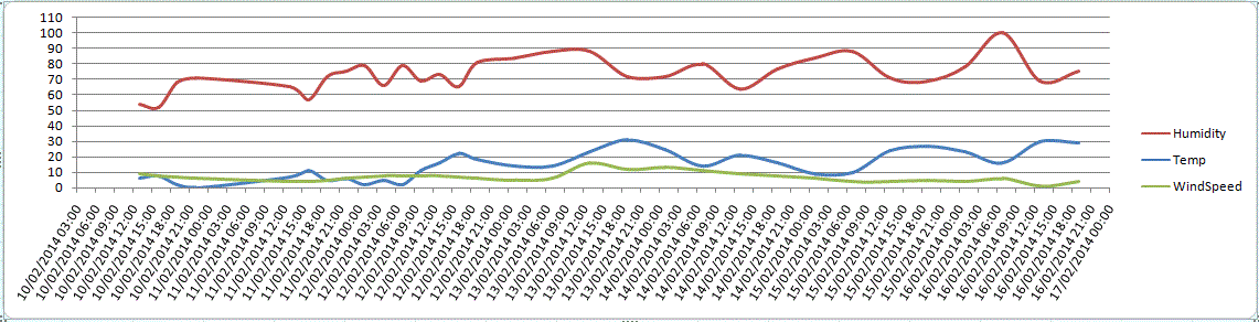 我需要从一些表格数据创建一个线条图。图表应显示天气(如温度)随时间的变化情况。但出于某种原因,结果看起来很奇怪(我附上了一张照片)。此外,图表将日期时间的小时部分显示为0。
