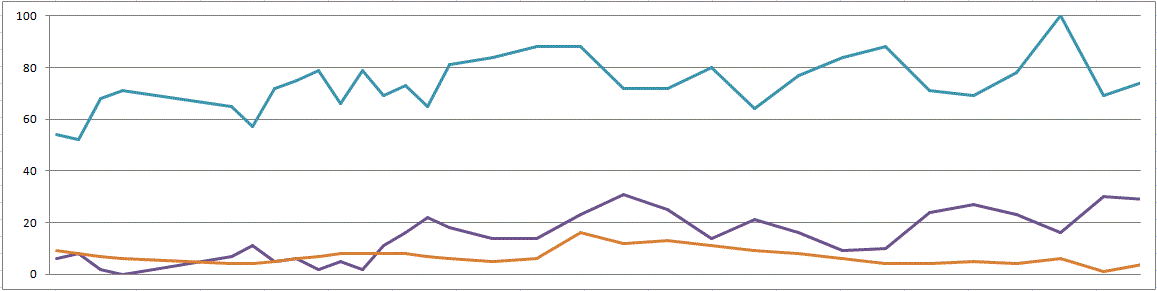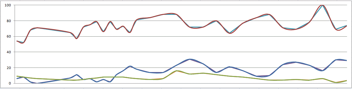 @乔恩·佩尔蒂埃(他现在对Excel图表等都了如指掌)已经指出,流畅的线条可能会误导人。(无意中,我提供了一个here的例子!)因此,为了更好地回答OP和比较,一个带有直线的稍微简化的版本: