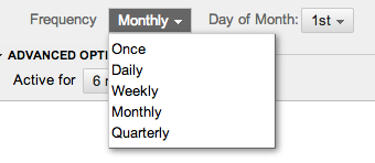 我必须每月从一份报告中发送前90天的数据。由于我无法在中完成预定的报告,所以我安排GA每月给我发一封电子邮件,作为提醒。然后我进入并手动创建90天报告,并使用GA使用一次频率发送电子邮件。