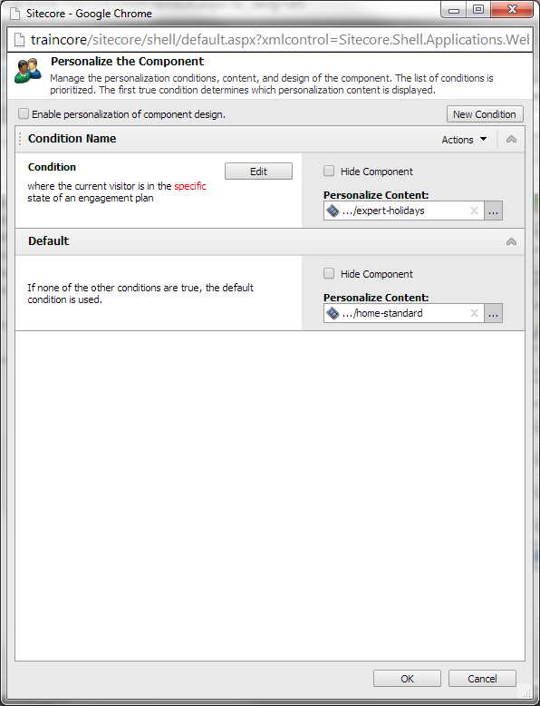 在这个小的默认示例中,您可以看到下面的默认情况,并且在下面看到一个新的条件,如果满足规则条件,它将显示不同的内容。我刚刚选择了一个默认规则,您可能应该创建一个以满足您自己的需求。