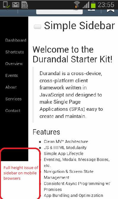 我尝试这样做:http://startbootstrap.com/simple-sidebar但是侧边栏固定的高度不能在移动浏览器上工作。