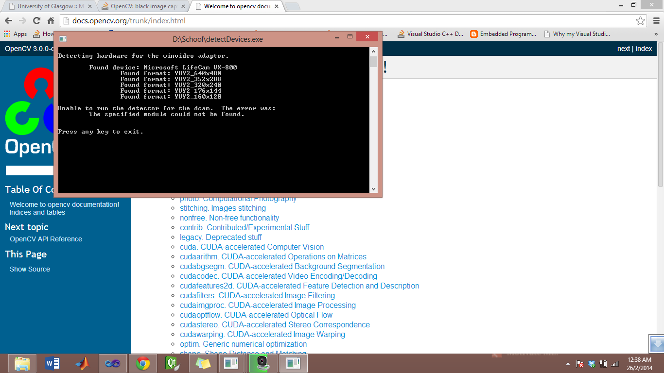 cout << cv::getBuildInformation() << endl;粘贴媒体I/O和视频I/O的结果?我想看看结果。我也怀疑你的库依赖,但既然你说它与罗技相机工作,我怀疑是这样的。当然,有可能是因为相机与OpenCV不兼容。顺便问一下,这台相机有牌子吗?