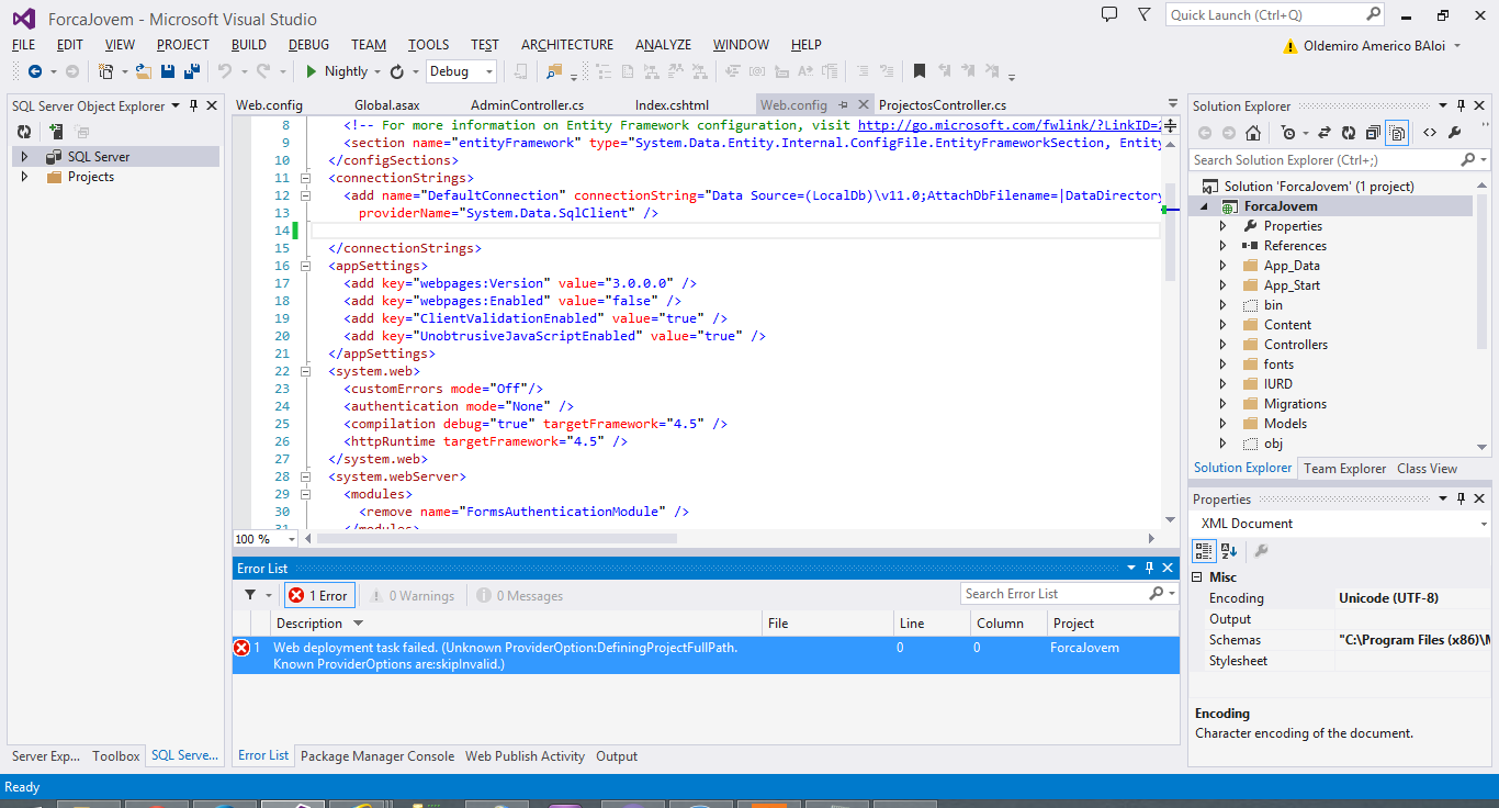 Web部署任务失败。(未知预留:DefiningProjectFullPath。已知的ProviderOptions是:SKIPIn有效值。)