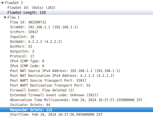 当从Wireshark观察到NetFlow分组时,具有模板id 263的流集包含有关启动器、八进制和响应方八进制的数据,这些数据可用于确定与流相关联的字节数。