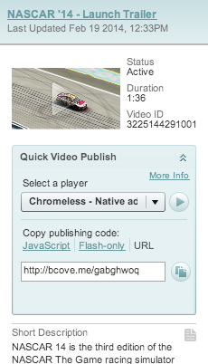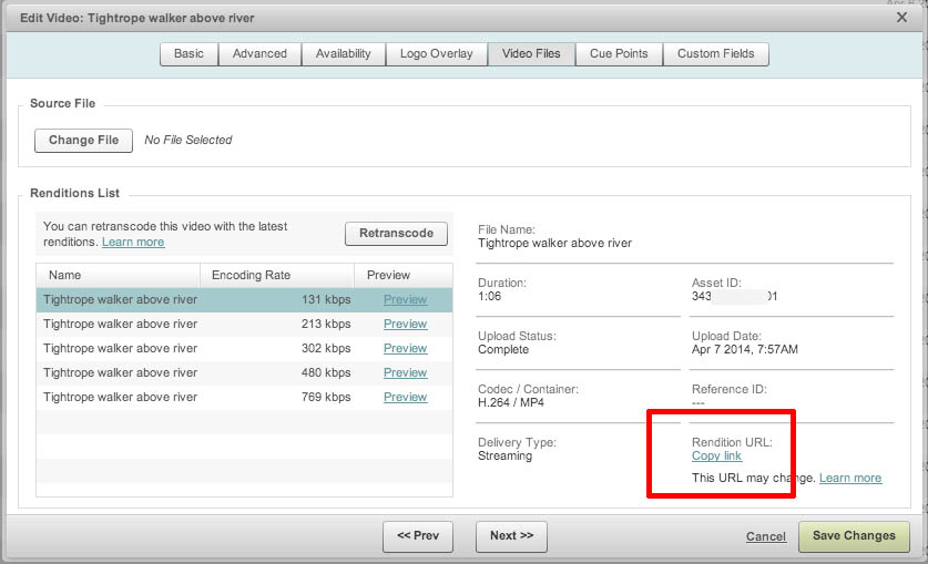 BrightCove似乎为想要将他们的文件流到自己的播放器的人提供了一个URL。如果在VideoCloud仪表板的“媒体”选项卡中找到视频并单击底部的“编辑”按钮,则可以获得视频详细信息。在“详细信息”的“视频文件”选项卡上,您将看到以下内容: