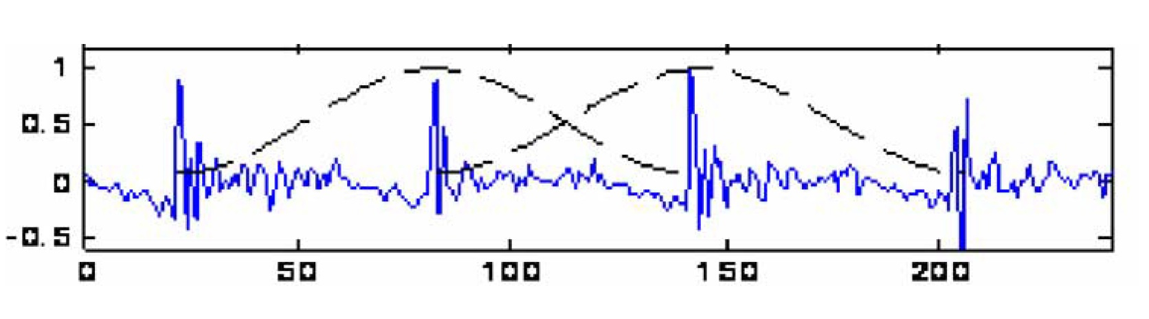 然而,我需要通过检测每个基音周期内的最大振幅来找出LP误差信号中的基音脉冲。对于每一个螺距脉冲,一个两个音高周期的汉明窗口长。如果T(i-1),T(i),T(i+1)表示连续三个螺距脉冲的位置。如何为从T(i-1)到T(i+1)的音高脉冲设计分析窗口,如下面的链接图所示?