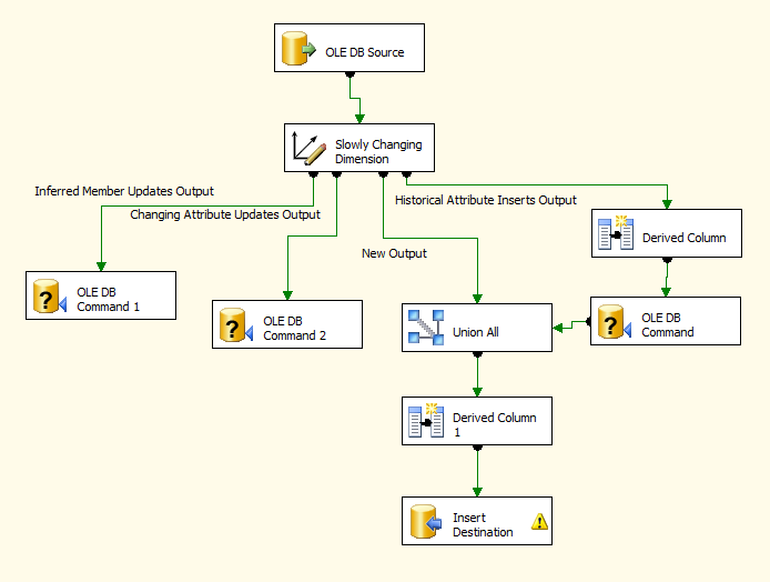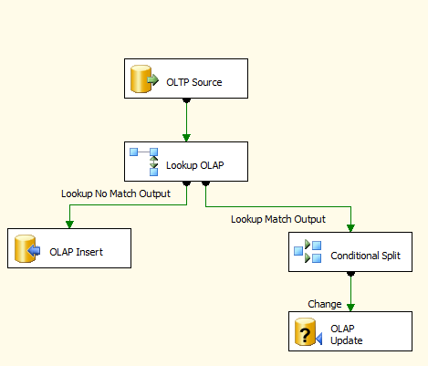 这是OLTP数据库中的OLE源,然后根据OLAP数据库查找代理键。在没有匹配的地方,它简单地将一个新记录插入到OLAP目的地,当有匹配时,它执行条件拆分,如果任何字段已经更改,它将使用OLE命令更新OLAP表。