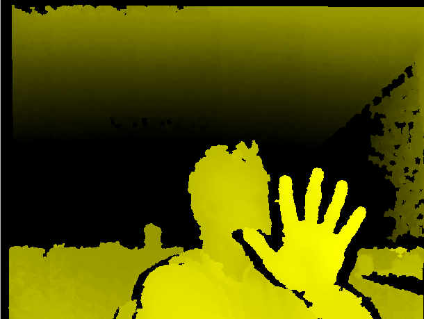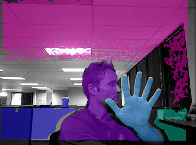 一旦你的对象被分割,你就可以测量你的片段之间的距离,分析它们的形状,识别工件或人类等等。然而,据我所知,骨架库可以在人类移动几秒钟后识别出它们。下面是一个简单的深度地图,它是在几个片段上使用深度而不是颜色信息破坏的。