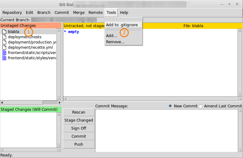 之后,您可以在Tools > Ignore selected file下在git gui中使用它。在Unstaged Changes -> Tools/ignore selected file下选择要忽略的文件