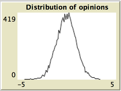 首先,定义了海龟自身属性turtles-own [opinion] .接下来是意见变量的随机正态分布(范围从-1到1)。我希望能够在-1到1之间考虑不同形状的意见分布。这是通过使用带有两个输入的random-normal命令来实现的: mean (设置为0)和std。dev.(由滑块设置);即由std给出形状。dev.价值。