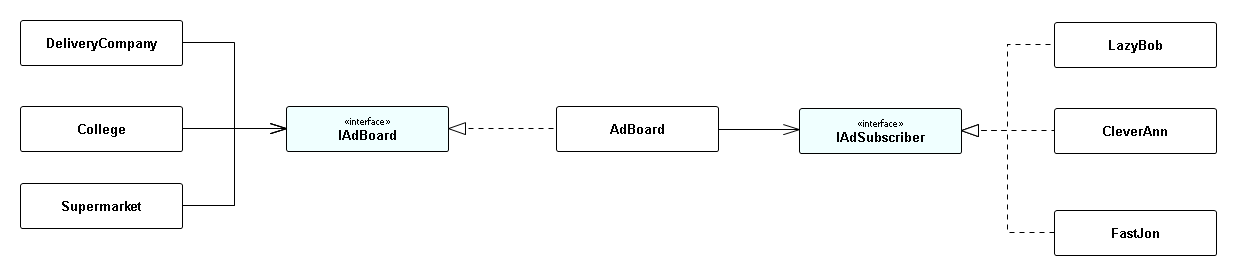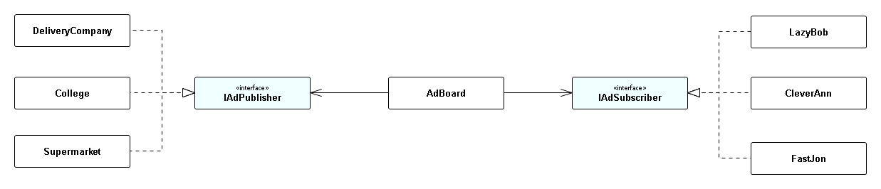 目标是从一组实体(DeliveryCompany、College、Supermarket)向另一组实体(LazyBob、CleverAnn、FastJon)传递信息(广告)。显然,我们需要一个中介(AdBoard),它将帮助出版商将他们的广告传递给合适的人和订阅者通知他们有趣的建议。